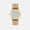With clean lines and a modern minimalist sensibility, the Elliot is a true design classic ready for workdays and weekends. Finished with a leather strap, this gold tone round watch features a dial detailed with a mix of numerical and stick makers and our Signature marker at 3 o