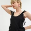 Cascading ruffles, embroidered details and a heart motif add airy romance to this lace mini dress. Featuring a removable black slip, it